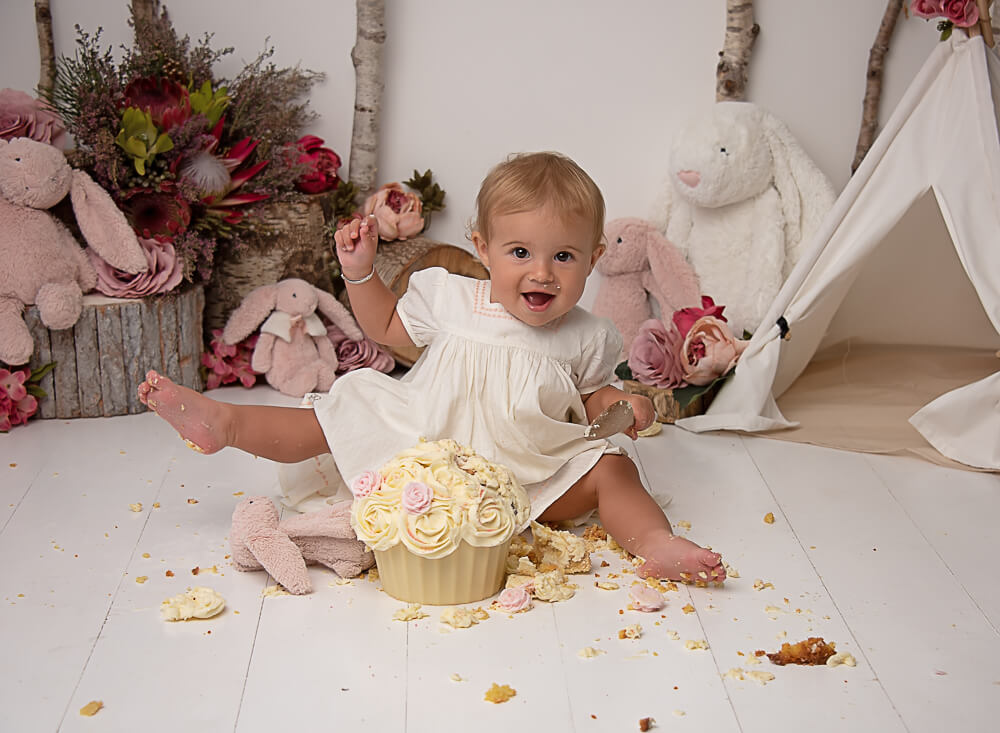 Woodland cake smash sessions for girls often get teamed up with florals and a fluffy animal or two, at their parents’ request. I love to get my thinking cap on to see what floral treats are available, depending on the time of year. Here is where connections come in, as I work closely with a local floraculturist to bring in seasonal flowers. To make the sessions even more special to you. I always team these up with florals from my own extensive collection as well. You know me, the more flowers the better!!