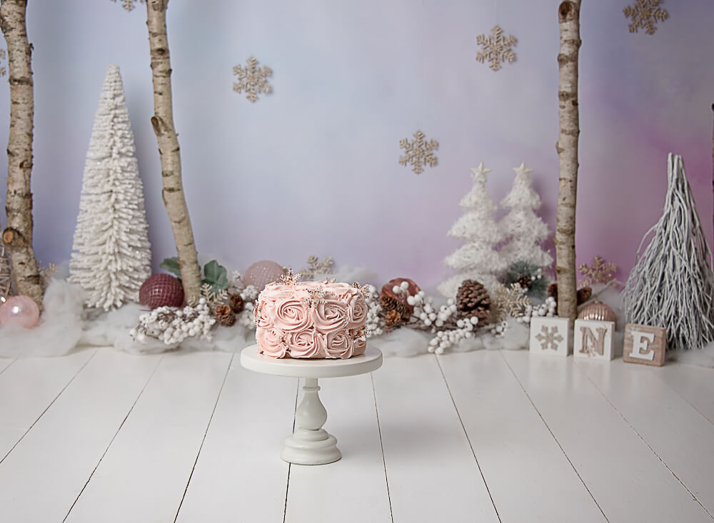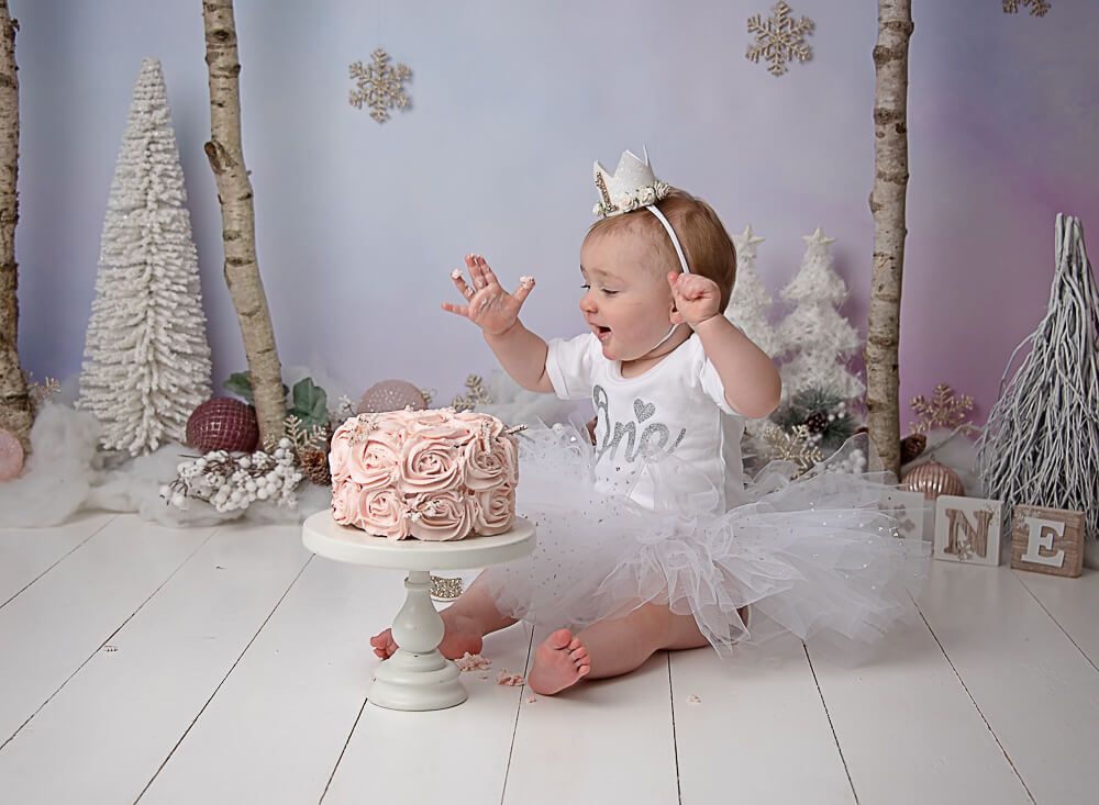 This particular woodland cake smash theme is one of my favourites. And whether the cake smash is for a boy or a girl it works equally well.  I have a range of different coloured backgrounds to pop behind the birch trees to give a different feel. And plenty of additional smaller festive trees to pop in front. Not to mention I get to use fake snow (Yay! SNOW!!!!!!) which gave the animals in the first image below the feel that they had been out foraging.