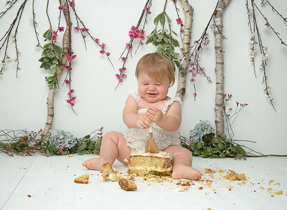 I often get asked by other photographers where I purchased this backdrop. It’s one that I use quite often for a woodland cake smash. There are so many photographers that purchase a pre-printed backdrop and use this to set the scene. But, not me. Every session is bespoke, designed and made up for you. Several years ago I sourced a number of gorgeous silver birch branches from a friend’s wood. They have been the backbone of these woodland cake smash sessions ever since. Teamed up with all sorts of colours they give a very different feel depending on the season the parents want, or which colours they would like me to include.