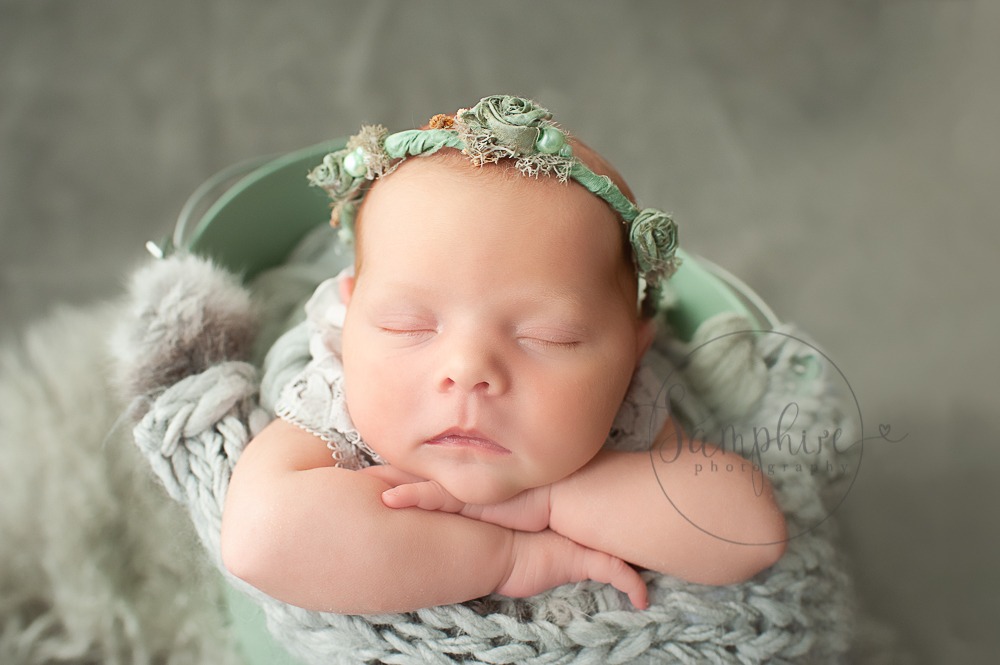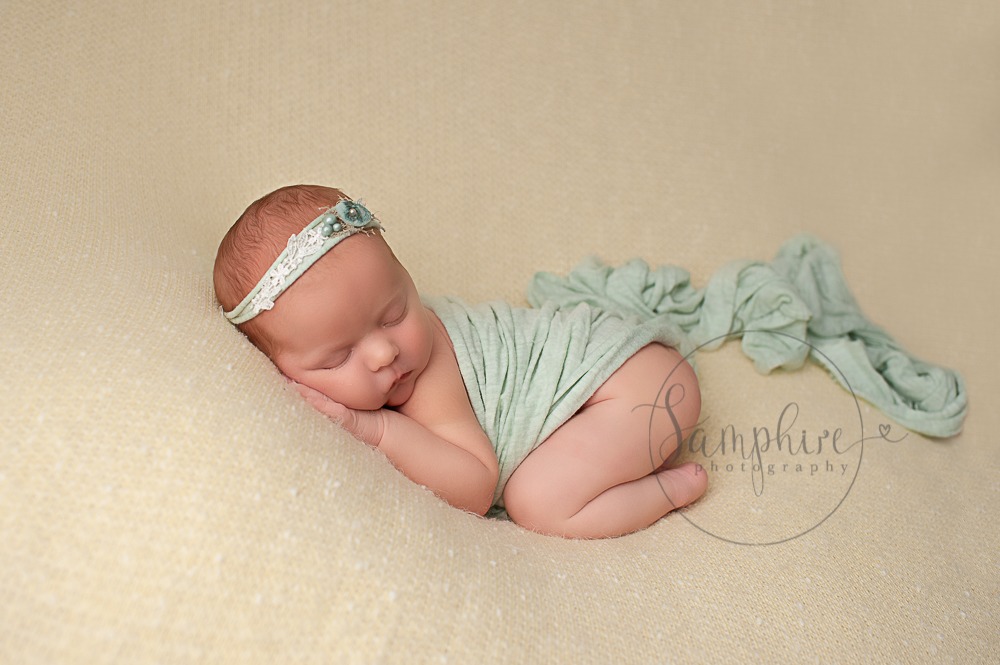Will you look at this adorable little poppet? Darling little Edith was an absolute pleasure to pose and photograph when she came to visit me in the Samphire studio for her newborn portraits at the tender age of just 18 days old. I chose a mix of soft creamy yellow and pale mint (one of my favourite colourways for both boys and girls) and they were perfect for this beautiful lady, who looked equally scrumptious in both bonnet and headbands. Swaddled and snug or simply snoozing in her perfect newborn skin, there just wasn’t a bad way to photograph this beauty.