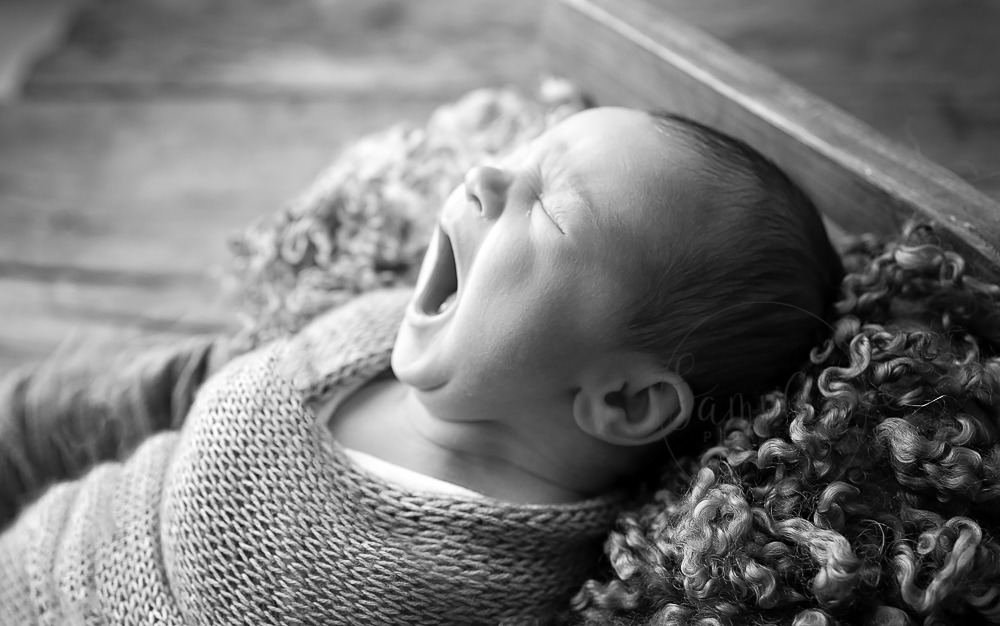 Newborn_Photography_West_Sussex_baby_yawning_Samphire_Photography 27 June 2019 Black & white studio portrait of baby boy yawning, wrapped in knitted layers by Samphire Photography Newborn Photography West Sussex